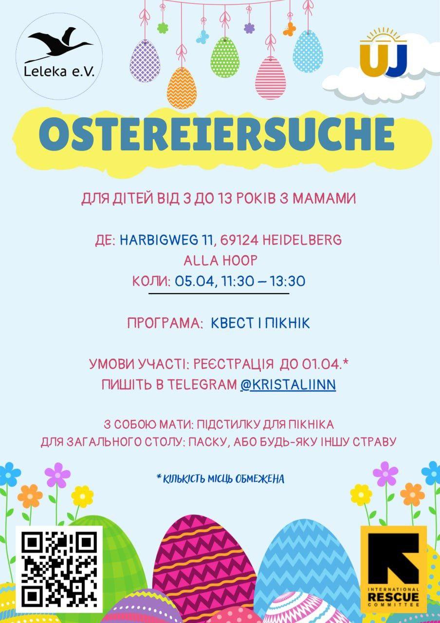 Liebe Freundinnen und Freunde, unser Team „Leleka“ hat eine Ostereiersuche für Kinder und ihre Eltern auf der Alla-Hopp-Anlage in Heidelberg organisiert. Insgesamt nahmen 20 Kinder im Alter von 7 bis 11 Jahren gemeinsam mit ihren Eltern teil. Während die Kinder mit Körbchen auf die Suche nach Schokoladen- und Spieleiern gingen, nutzten die Eltern die Zeit für Gespräche bei einem Picknick.